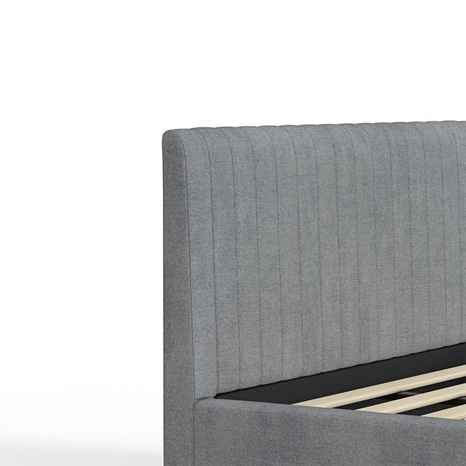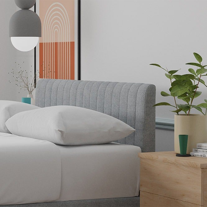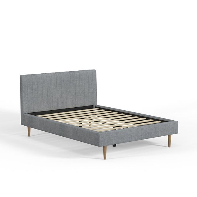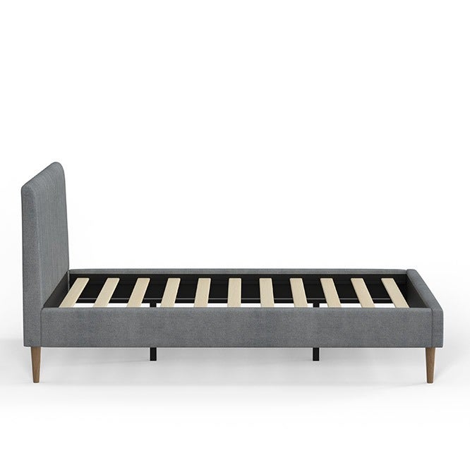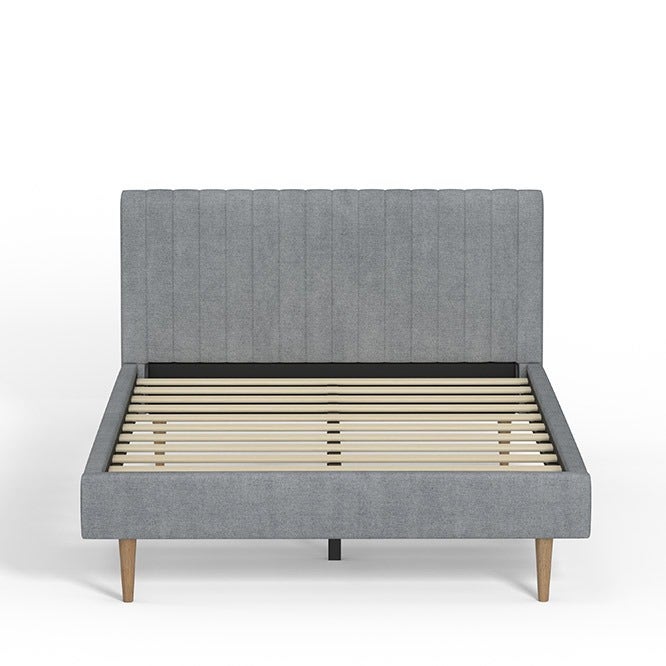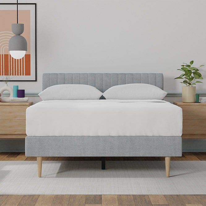 Upgrade your bedroom with The Claremont Bed Frame, which features a plush padded headboard, sleek midcentury style, and soft upholstery — no box spring needed.