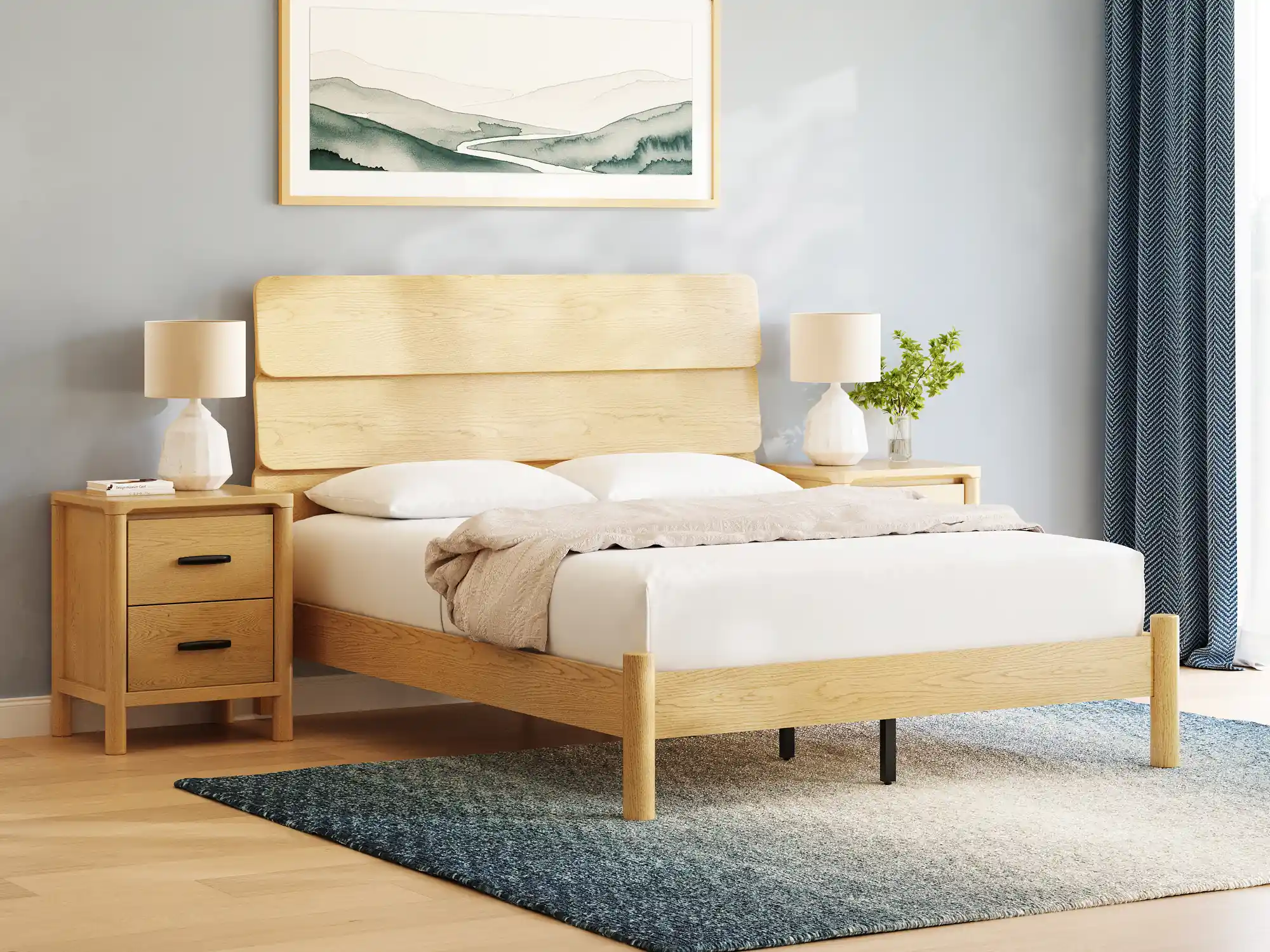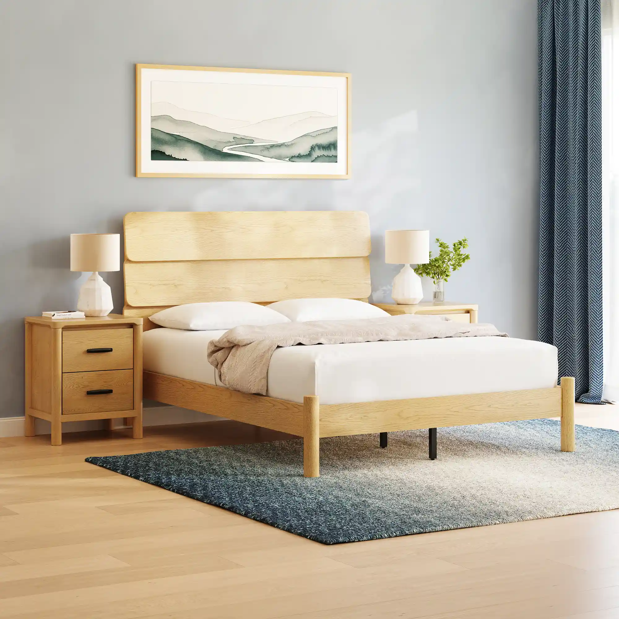 The Lumea Platform Bed Frame features a light oak finish, tiered headboard, and contemporary design that works with any bedroom. Add the matching Lumea Nightstand to complete your space.